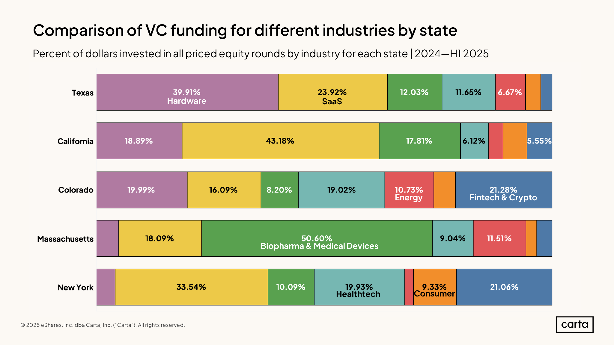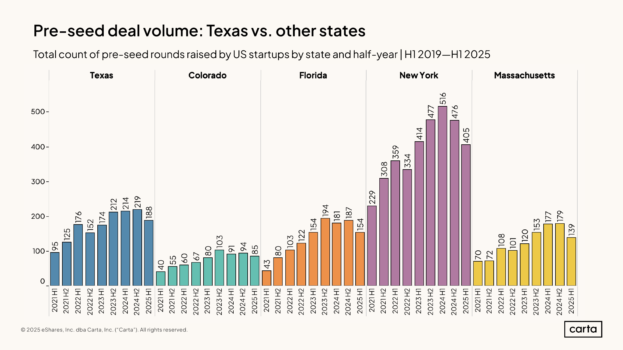 Itâs easy to miss in aggregate data, but when you isolate seed, Texas now ranks ahead of Massachusetts for the first time, sitting just behind California and New York. This reordering marks a new normal thatâs been building for years, and we see this continuing as Texas cements its spot as the third largest state for VC funding in the coming years.